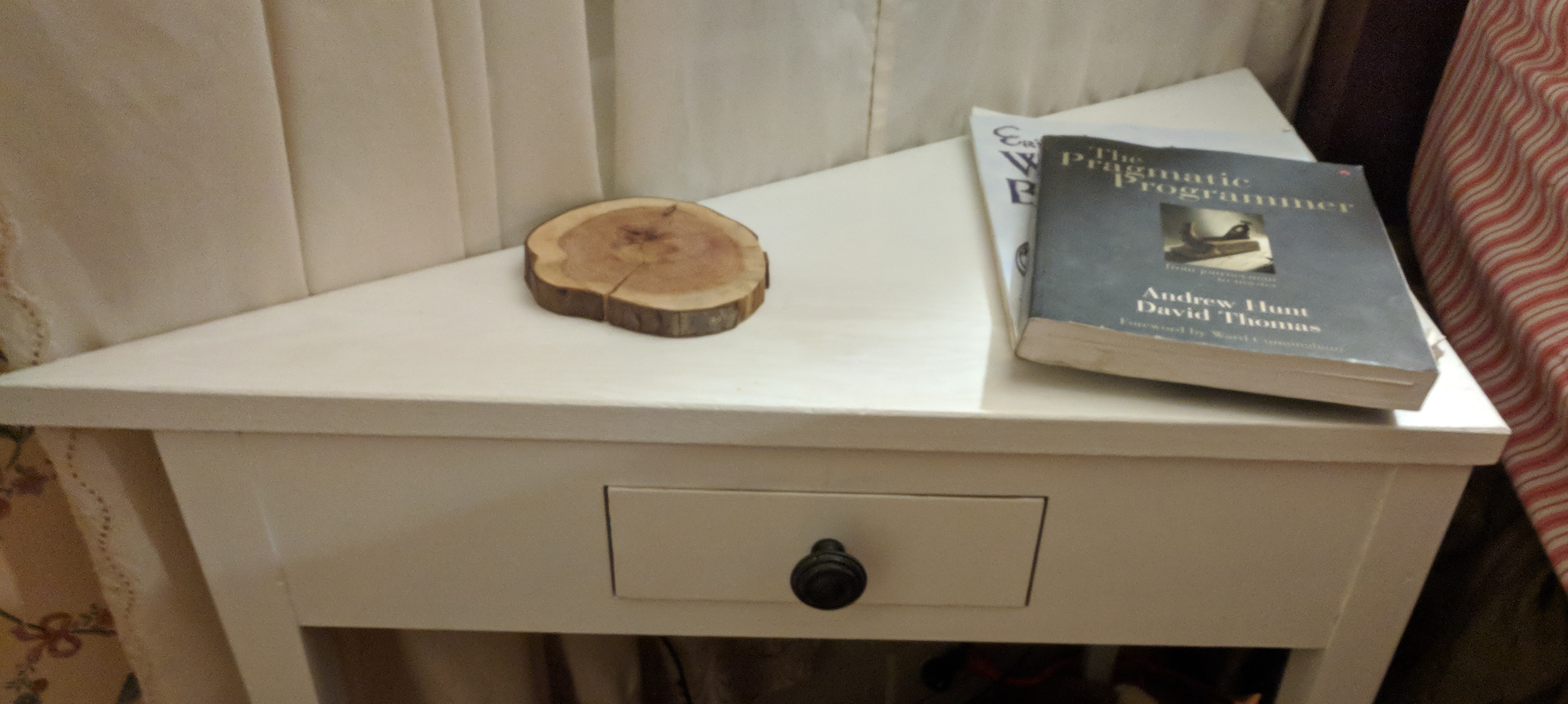 It’s always a little random when I decide to fix something and this was no exception. Let’s start with the problem: I don’t have a nightstand. So I didn’t have a nice place to charge my phone and store incidentals like books and headphones or a cup of tea. There are lots of nightstands available on the market but the wall behind my bed is shaped like this \_____/ so I needed an odd-shaped table. Since I needed a custom solution, I had the opportunity to make it special and did not hold back in this project, opting for an integrated USB charging hub tucked in the back!